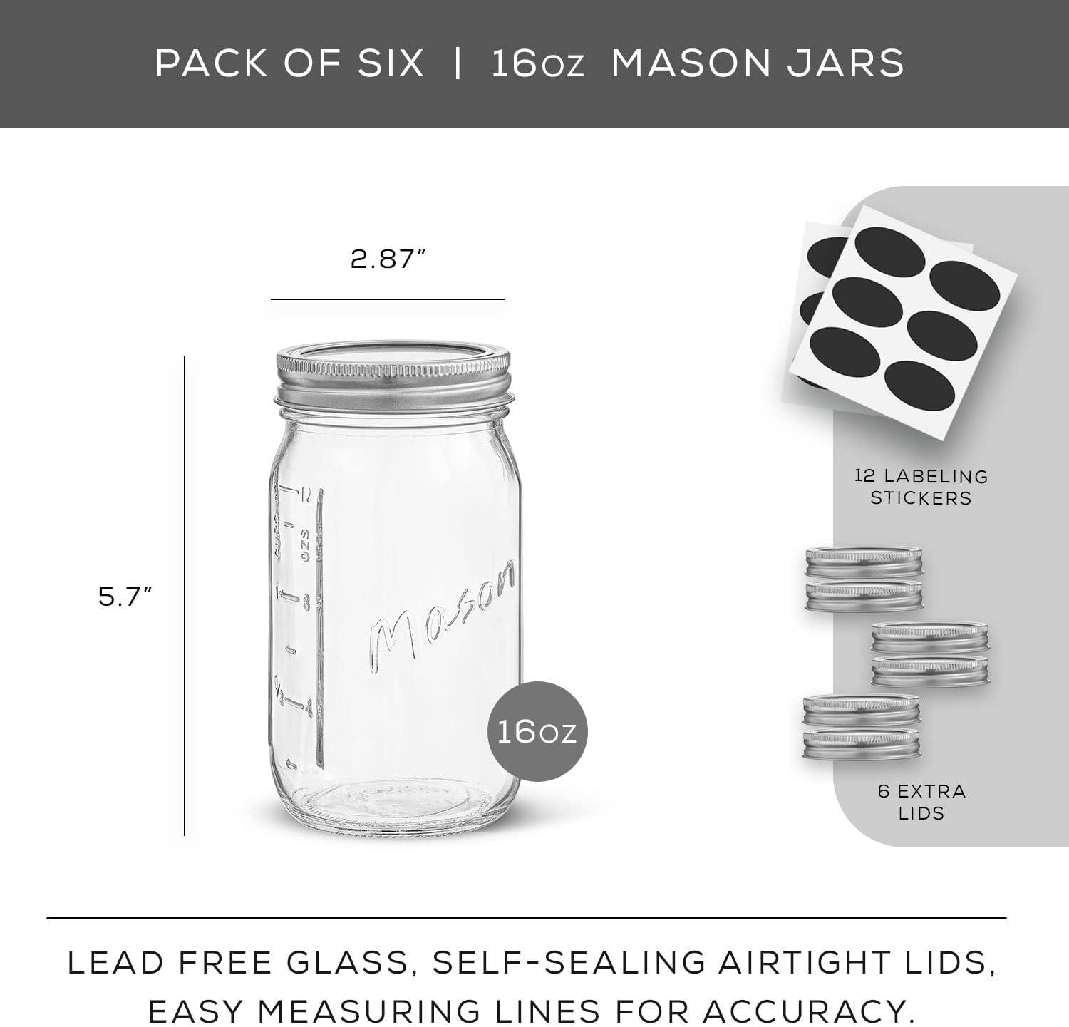 JoyJolt 8 Oz Mason Jars With Lids, Labels and Measures! 6-Pack Regular Mouth Mason Jars, Glass Jar with Lid and Band. Airtight Canning Jars, Overnight Oats Jars, Salad Jars, Sourdough Starter Jar(16 Oz)