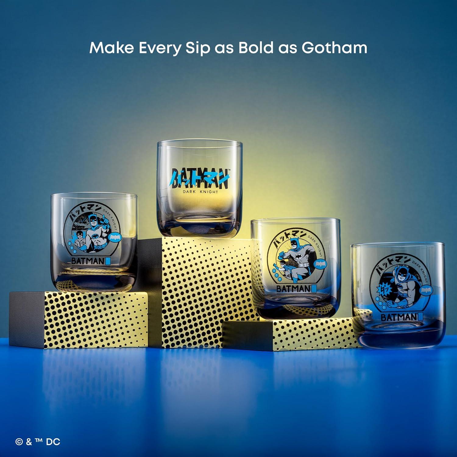 BOLD COMIC DESIGN: Celebrate Gotham’s legend with a Batman glass set that channels classic Dark Knight comic style. Each 10oz glass features vivid Batman artwork, dynamic action-packed scenes, and even Robin, making every piece a striking collectible (that's also made for everyday use!).