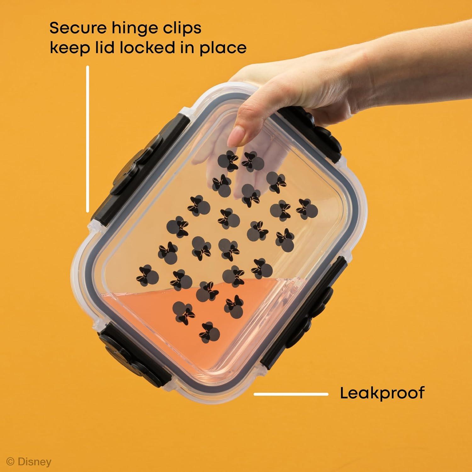 AIRTIGHT SNAP LIDS: Our BPA-free air tight containers for food feature a removable silicone seal, so air and odors can't get in or out. They're also leakproof! With adorable black Mickey or Minnie ears on every hinge clip, your soup, snacks, or meals always stay fresh, secure, and spill-free.