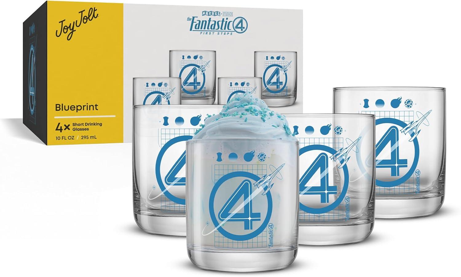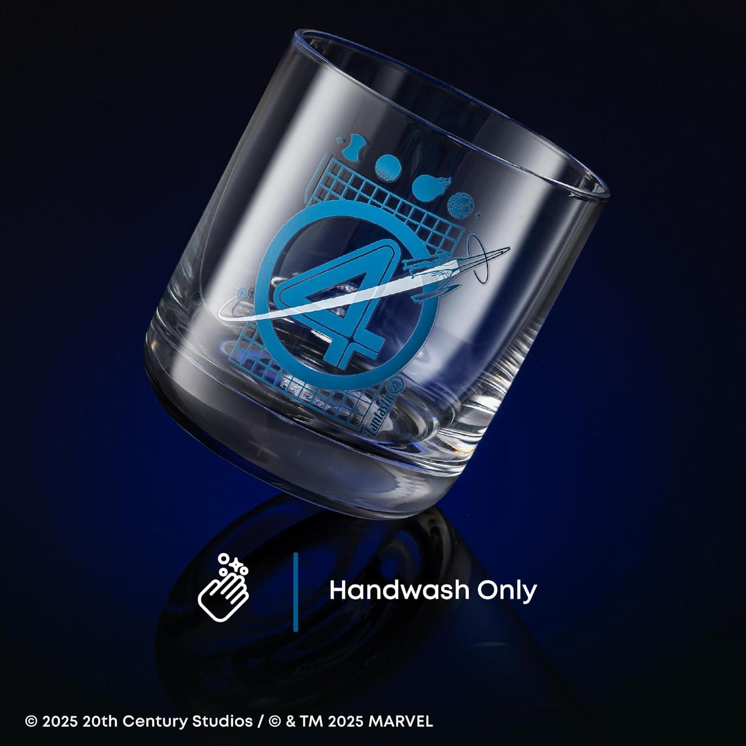 BLUEPRINTS OF THE BOLD: Elevate your drinkware with Marvel Fantastic Four glassware! Each tumbler features the signature emblem afront a grid-inspired blueprint, iconic character symbols, and a retro-style rocket. A must-have for fans who love their drinks served with a side of superhero style.