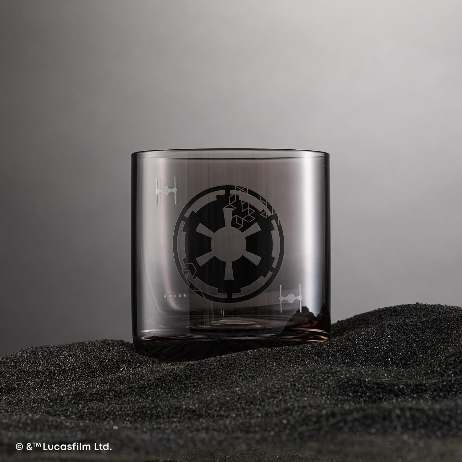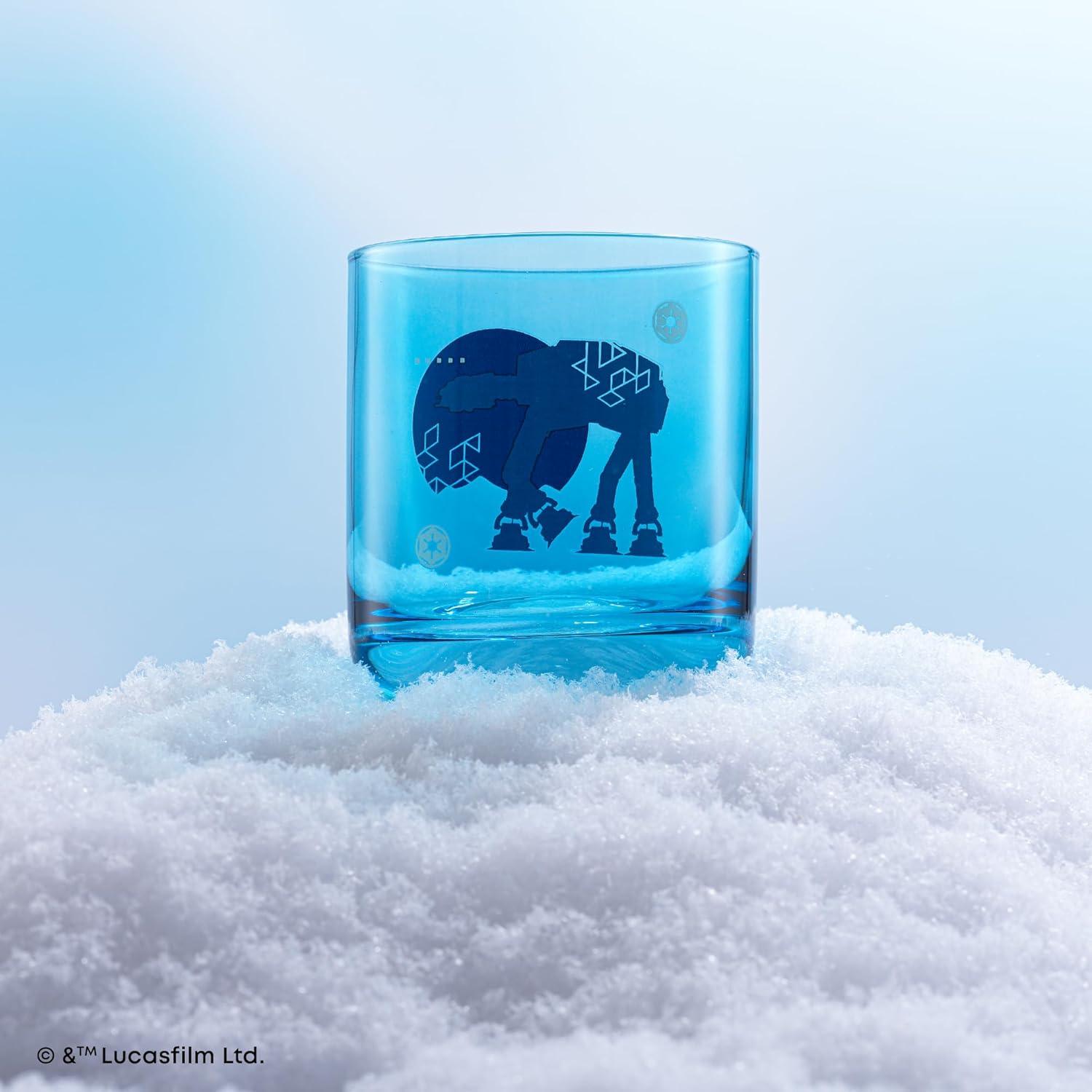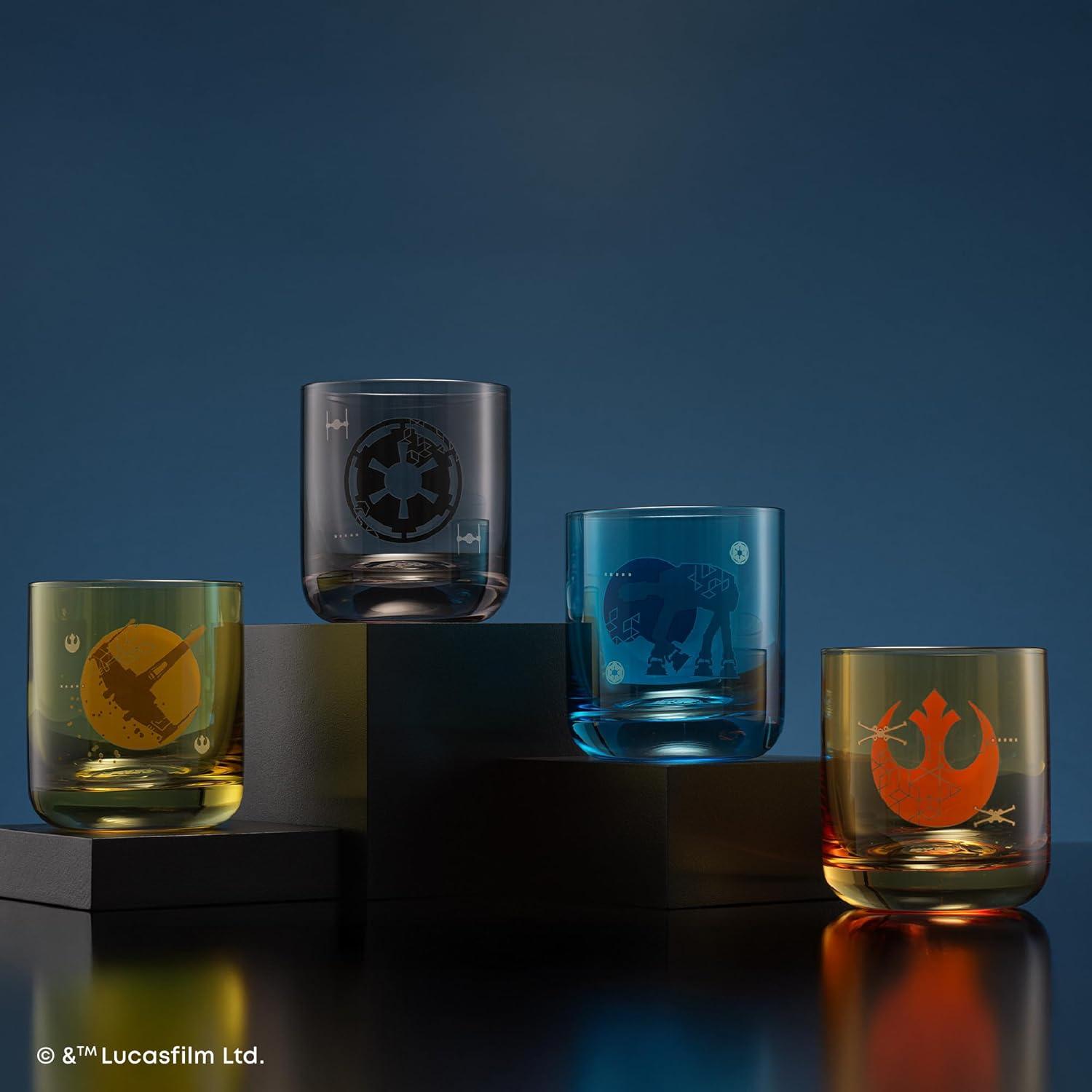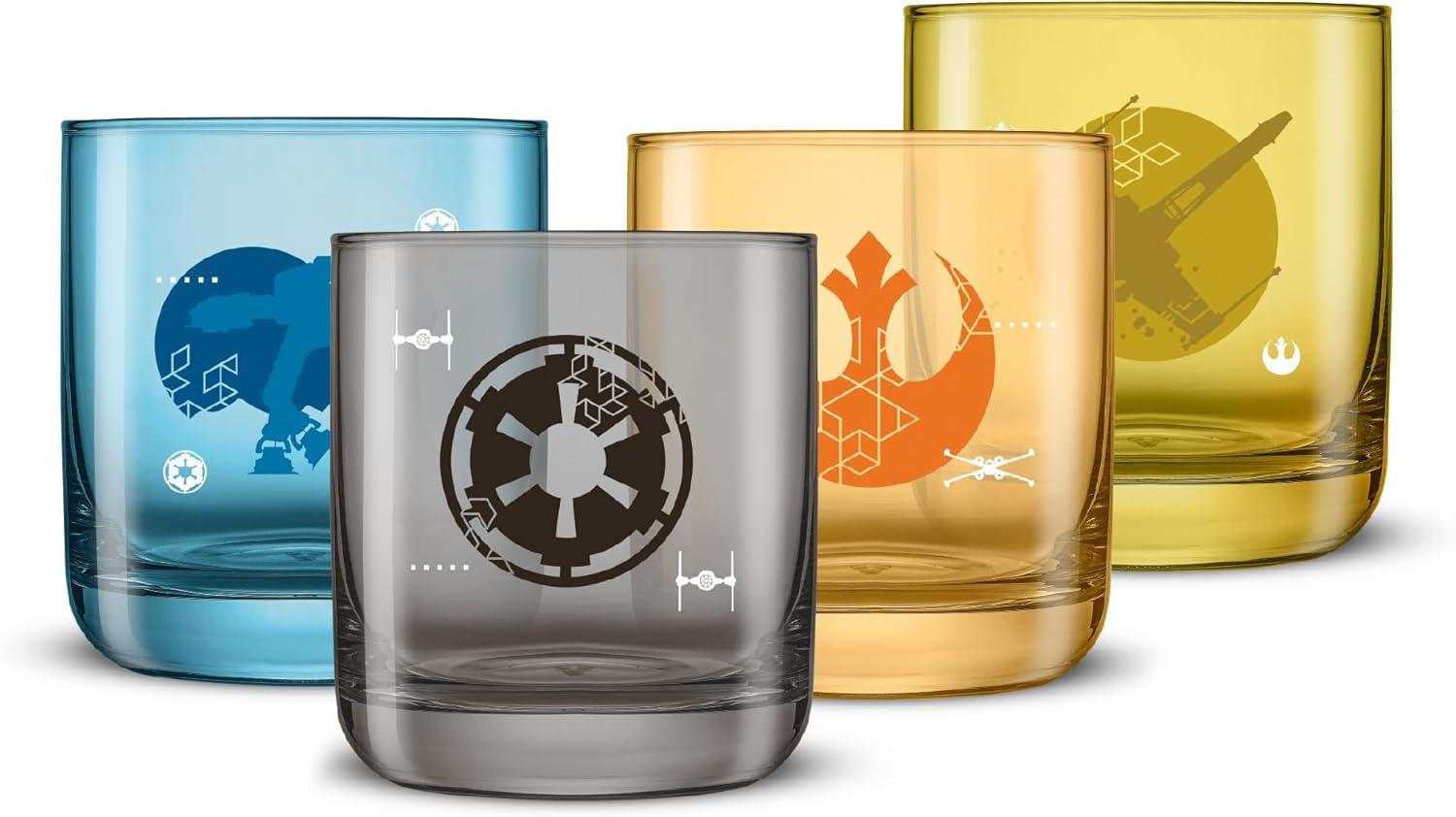 GALACTIC ICONS IN COLOR: A modern take on Star Wars classics: Rebel Alliance, Galactic Empire, X-Wing, and AT-AT Walker icon crests are featured in geometric detail on colored glass cups. A subtle nod to the saga, designed for everyday use or for displaying your fandom.